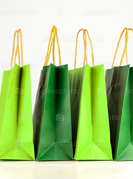 Набор сумок для покупок из крафт-бумаги подряд на белом фоне. Концепция покупок
