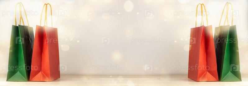 Торговый баннер. зеленые и красные сумки для покупок из kraft-бумаги на фоне боке. Концепция Frstive Shopping