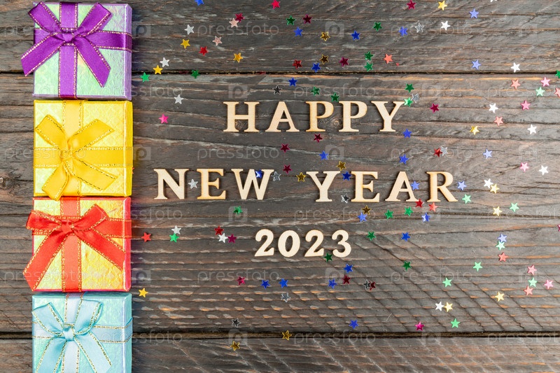 Разноцветные подарочные коробки. Новогодние подарки на деревянном столе. Текс С Новым 2023 годом. Праздничная открытка. Плоская укладка