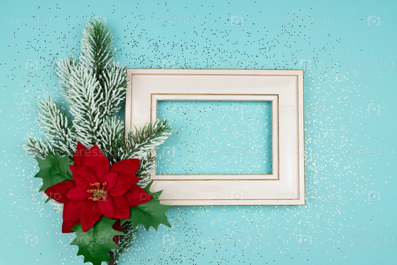 Праздничная открытка на Рождество с фоторамкой, еловой веткой и пуансеттией на синем фоне конфетти