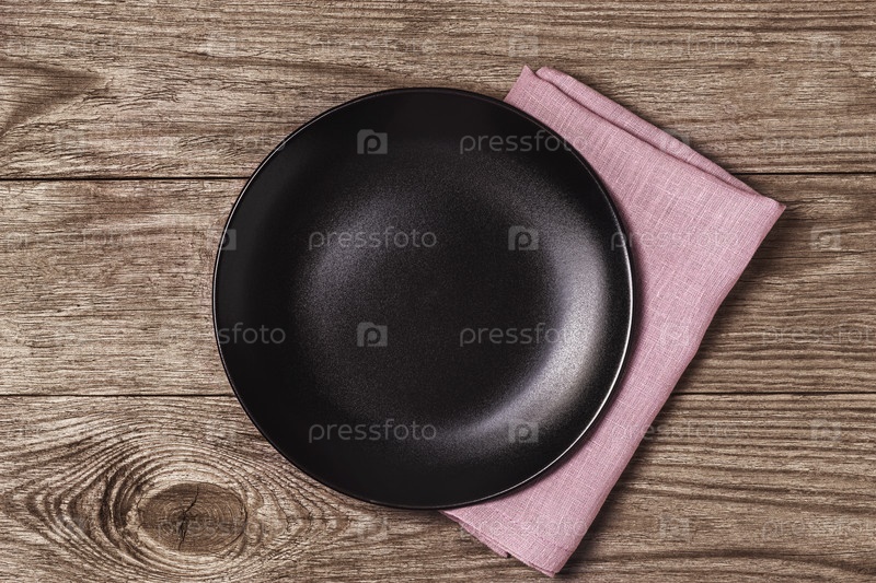 Пустая черная керамическая тарелка с фиолетовой салфеткой на деревянном столе, вид сверху. Продовольственный фон