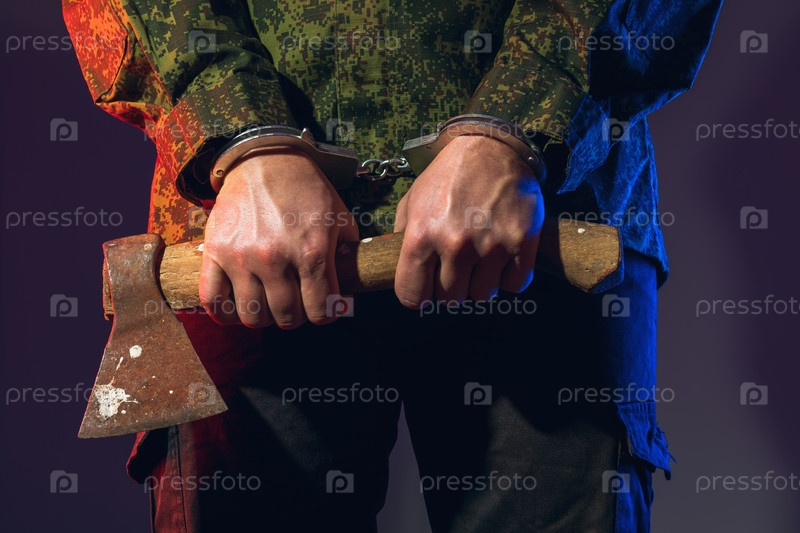 Человек в наручниках с топором в руках, концепция ареста преступника