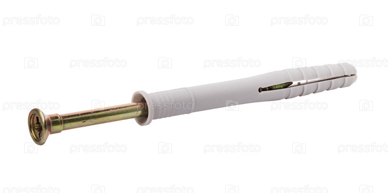 Потайной саморез в пластиковом дюбеле, изолированном на белом фоне
