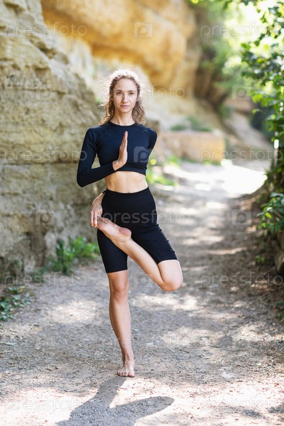 Молодая женщина, ведущая здоровый образ жизни и практикующая йогу, выполняет различные упражнения врикшасаны, позу дерева с намасте, тренируется в парке, стоя босиком на дорожке