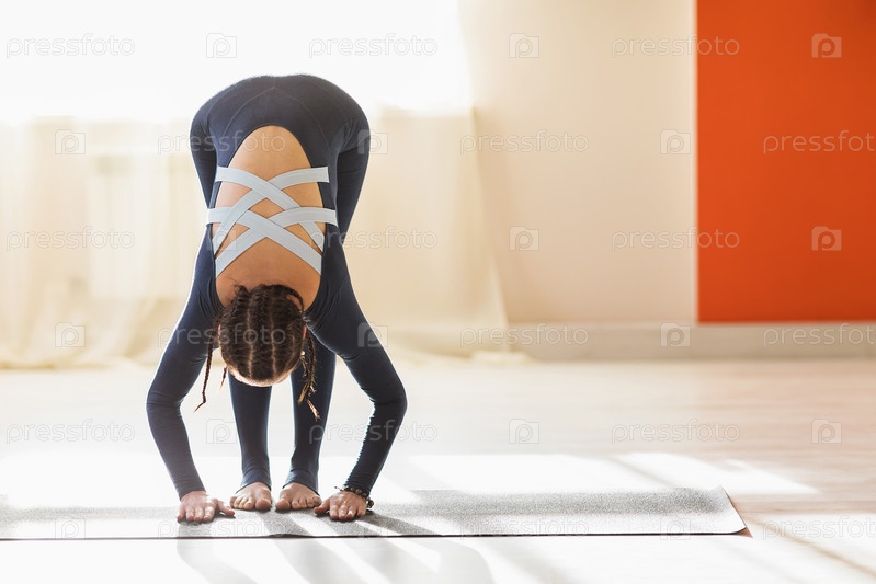 Спортивная женщина, ведущая здоровый образ жизни, занимается в зале, стоя на коврике, выполняет наклоны вперед, чтобы растянуть мышцы спины и ног
