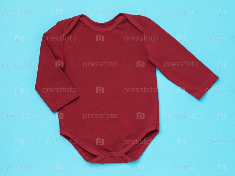 Детский боди с длинными рукавами бордового цвета на синем фоне, вид сверху