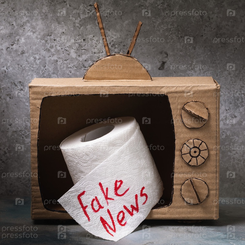 Картонная модель телевизора с торчащим из экрана рулоном туалетной бумаги. Концепция фейковых новостей