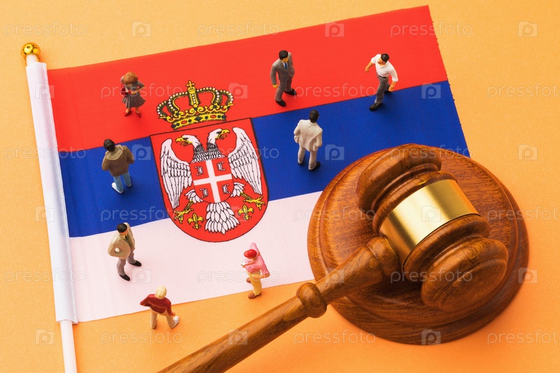 Молоток судьи, сербский флаг и пластиковые игрушки на цветном фоне, концепция судебных процессов в сербском обществе, вид сверху