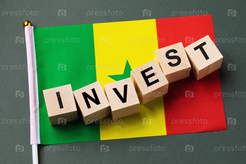 Деревянные кубики с текстом и флагом на цветном фоне, концепция инвестиций в Сенегале