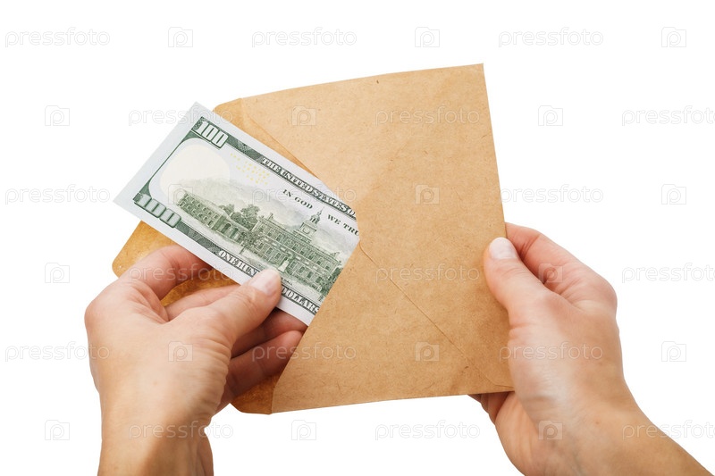 Мужчина достает сто долларов из конверта, концепция изолирована на белом фоне, крупным планом