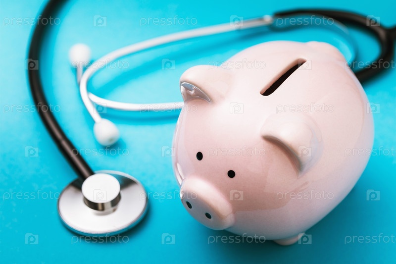 Копилка и медицинский стетоскоп на синем фоне. Концепция на тему накопления денег на лечение