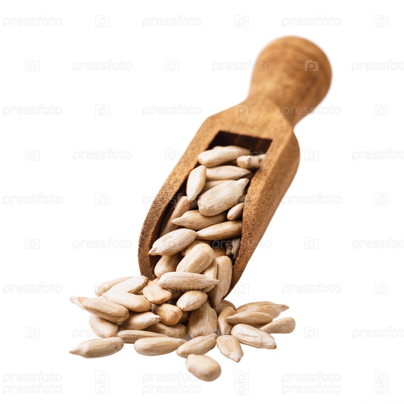 Совок, полный семян подсолнечника, изолированные на белом фоне