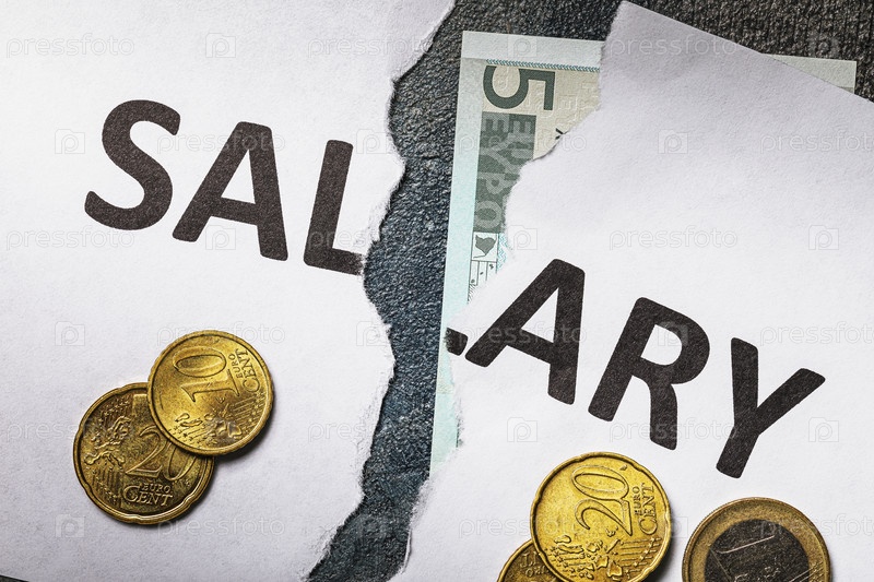 Надпись оклад разорвана пополам, а рядом монеты евро. Концепция финансового кризиса. зарплаты не будет