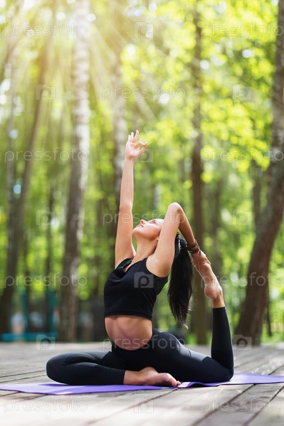 Молодая женщина в спортивной одежде занимается йогой на открытом воздухе, делает позу голубя с вытянутой рукой. Экапада раджакапотасана