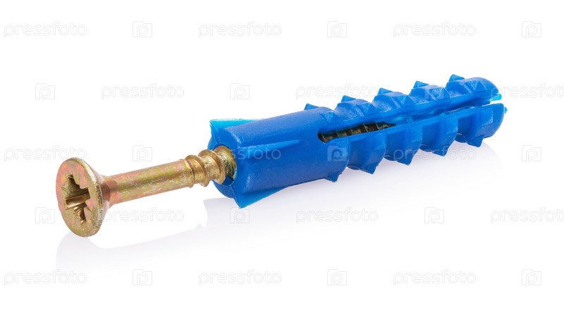 Саморез в пластиковом дюбеле, изолированном на белом фоне. Стек фотографий
