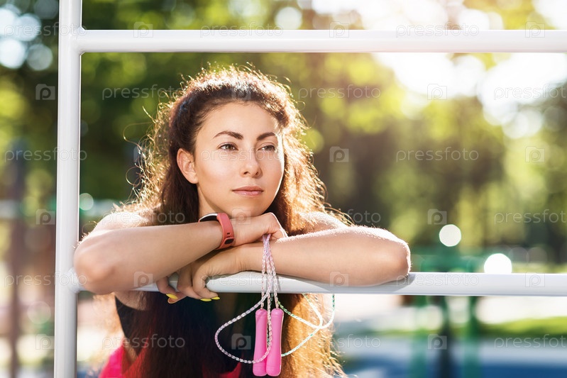 Портрет молодой красивой девушки со скакалкой в руках на спортивной площадке