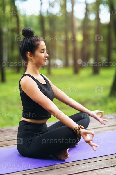 Красивая брюнетка занимается медитацией на деревянном мосту летним солнечным утром