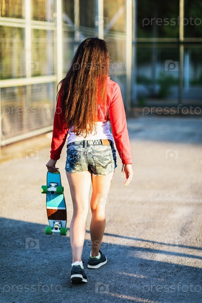 Девушка со скейтбордом в руках идет на спортивную площадку летним теплым солнечным вечером