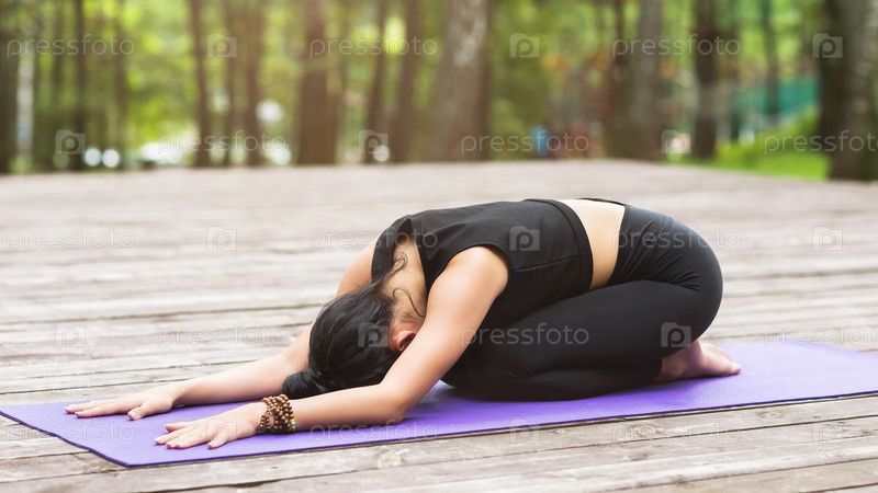 Женщина-тренер теплым летним утром в спортивной одежде сидит на ковре, практикует асану йоги, выполняет позу матери