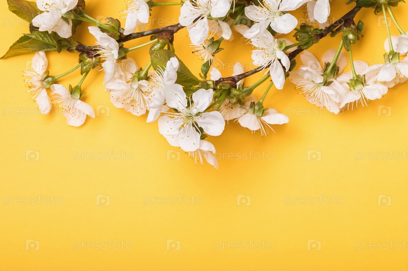 Цветущие ветки вишни на желтом фоне с копировальным пространством, вид сверху