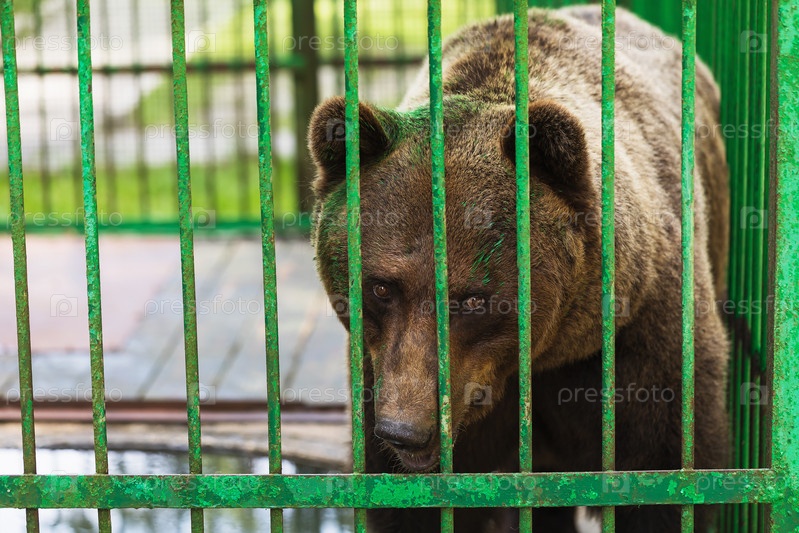 Медведь в клетке с раскрашенным лицом. Концепция на тему жестокого обращения с животными