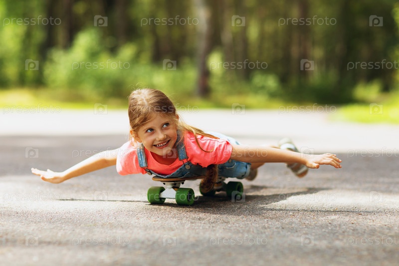 Счастливый ребенок катается на скейтборде в парке солнечным летним утром