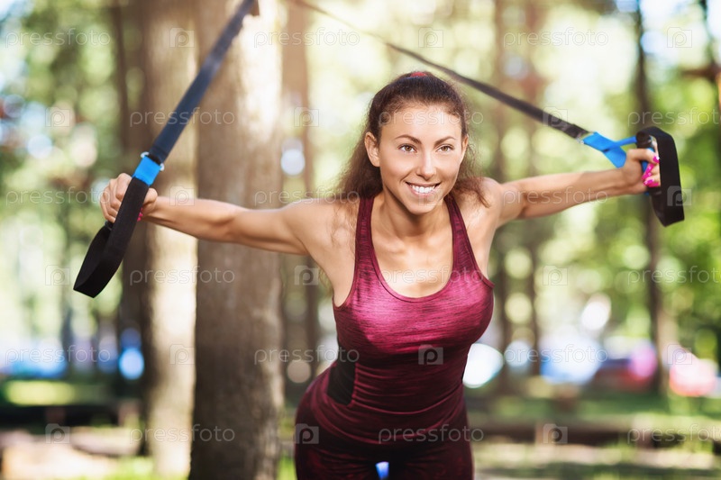 Красивая шатенка с длинными волосами в спортивном костюме делает упражнения в парке на подвесном тренажере. Спортсмен тренирует мышцы груди