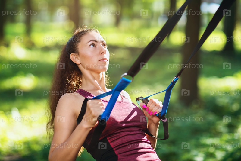 Привлекательная шатенка с длинными волосами в спортивном костюме делает упражнения в парке на подвесном тренажере. Спортсменка тренирует мышцы спины