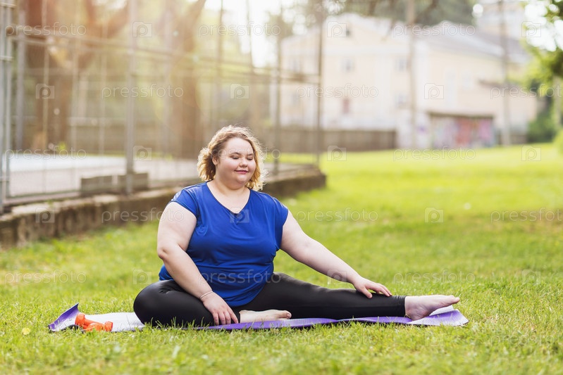 Молодая блондинка больших размеров выполняет упражнения на гибкость на открытом воздухе. Концепция здорового образа жизни