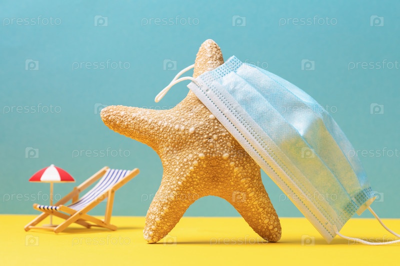 Медицинская маска, морская звезда и игрушечный шезлонг на цветном фоне, концепция на тему ношения масок на пляже