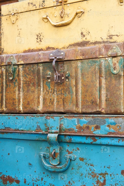 Стек металлических ржавых чемоданов - винтажное украшение для интерьера или сада. Фоновая текстура