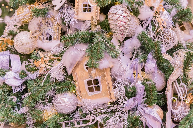 Рождественские и новогодние праздники фон. Елка украшена белыми и золотыми шарами, рыжими домиками, шишками и лентами. Концепция праздника