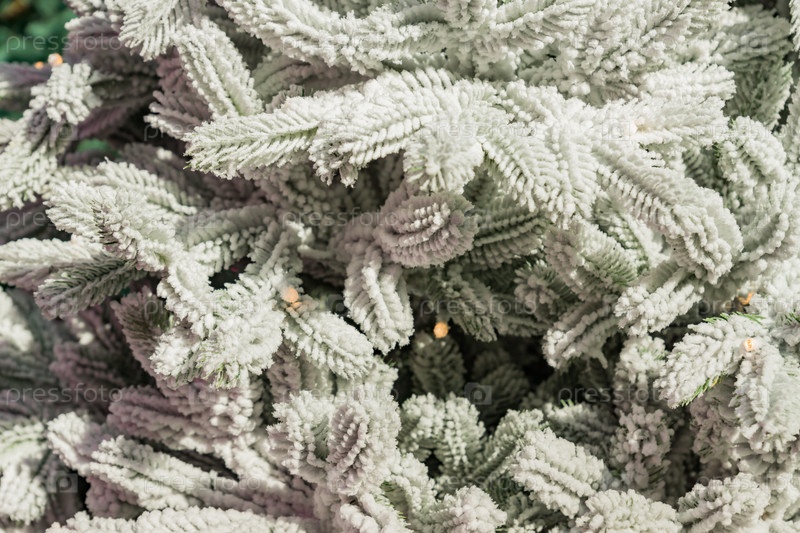 Рождественские и новогодние праздники фон. Новогодняя елка украшена искусственным снегом и гирляндами. Блестящие и сверкающие. Концепция праздника