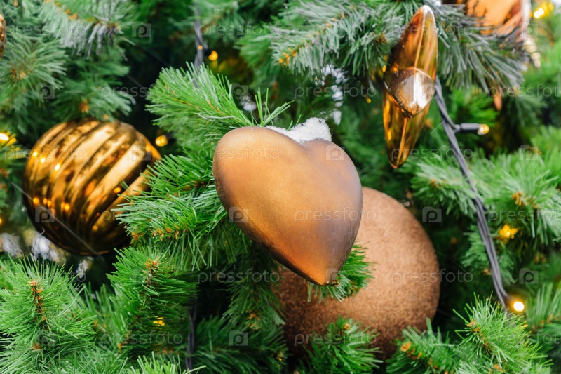 Рождественские и новогодние праздники фон. Рождественская елка украшена золотым сердцем и шарами. Концепция праздника