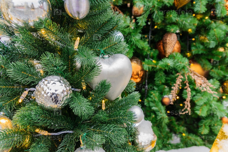 Рождественские и новогодние праздники фон. Рождественская елка украшена серебряными шарами и сердцами. Концепция праздника