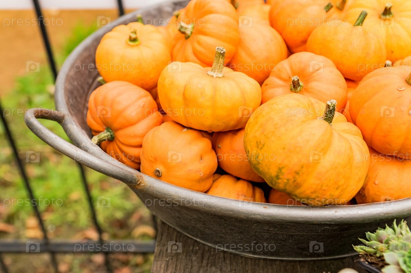 Маленькие оранжевые тыквы в металлической корзине. Деревенский стиль. Стойка на фермерском рынке