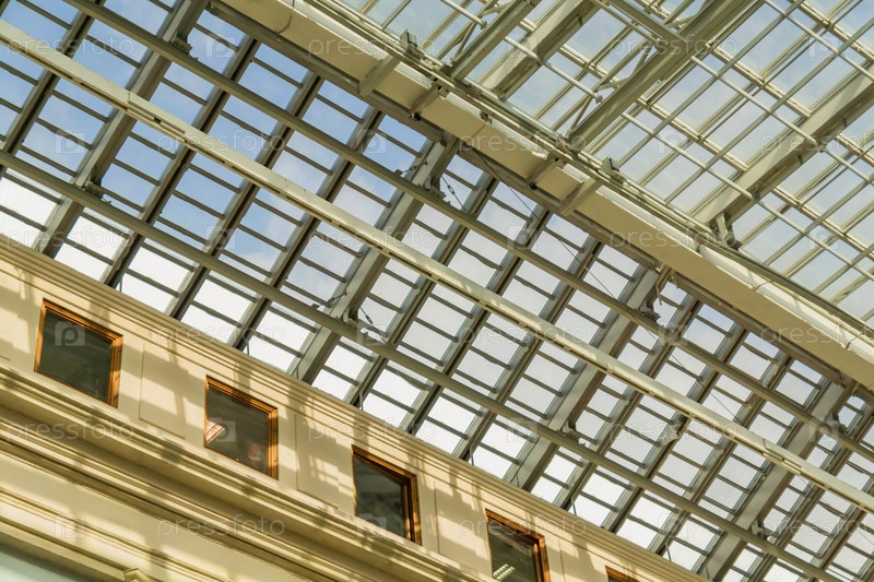 Вид на крышу снизу. Металло-стеклянная конструкция. Интерьер