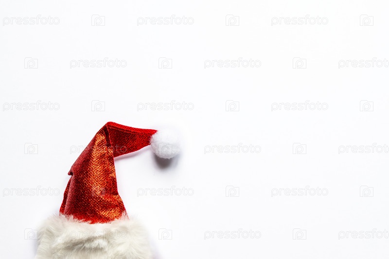 Красная сверкающая шляпа санта на белом фоне с копировальным пространством