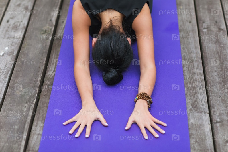 Молодая женщина в спортивной одежде сидит на ковре, практикует асану йоги, выполняет детскую позу