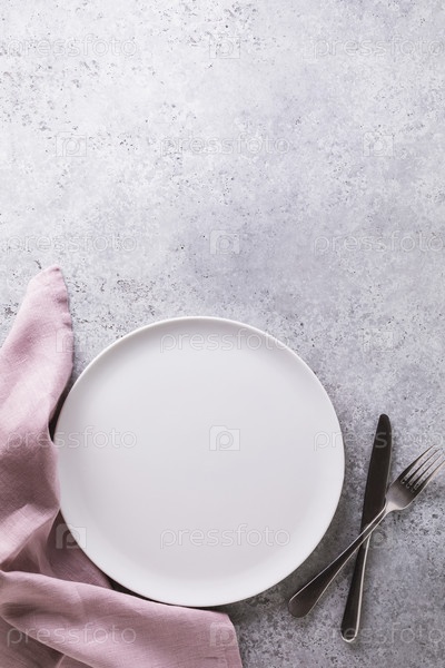 Керамическая тарелка, салфетка и столовые приборы на столе с бетонной текстурой, вид сверху. Продовольственный фон