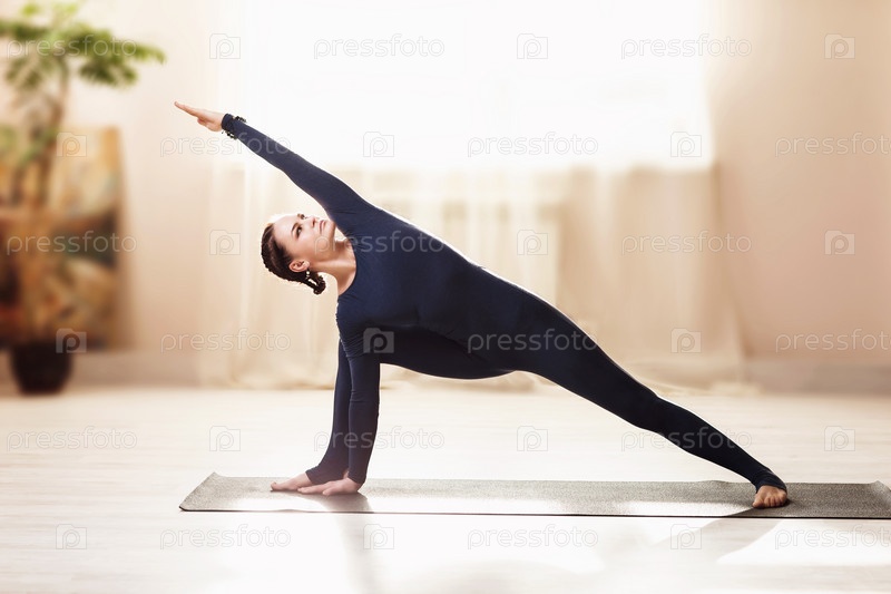 Женщина в синей спортивной одежде занимается йогой, делает упражнения утткита паршваконасана в квартире у окна