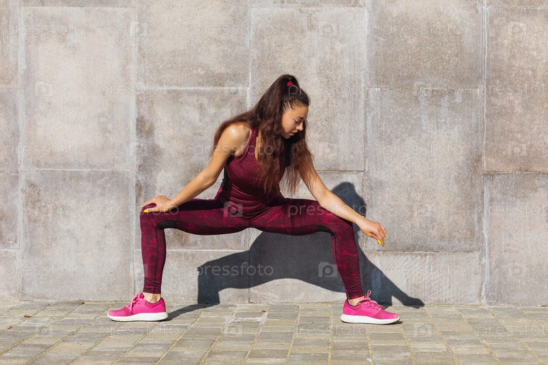 Молодая женщина занимается упражнениями летним солнечным утром у стены