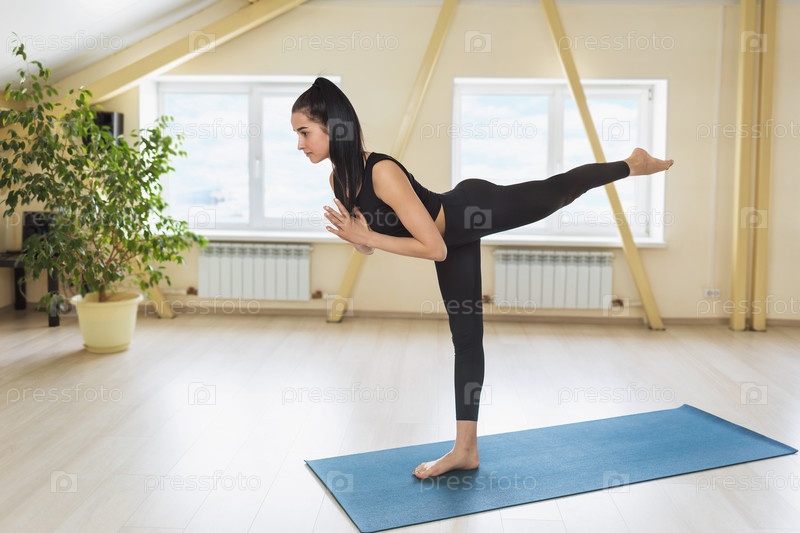 Молодая красивая женщина в черной спортивной одежде практикует йогу, делает упражнение "Воин 3", поза "Вирабхадрасана 3"