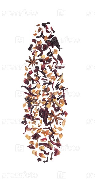 Фруктовый и травяной чай с падающими сушеными листьями гибискуса, цедрой цитрона, имбирем и др