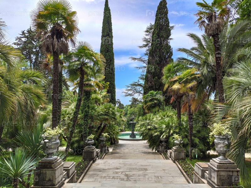 Панорамный вид на парк с лестницей и тропическими деревьями и пальмами