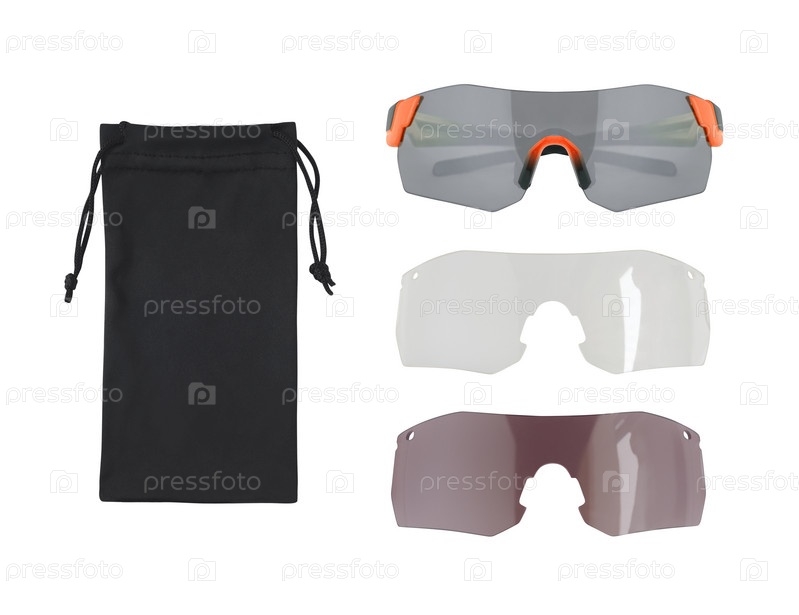 Вид сверху на спортивные солнцезащитные очки с разными линзами и изолированным футляром