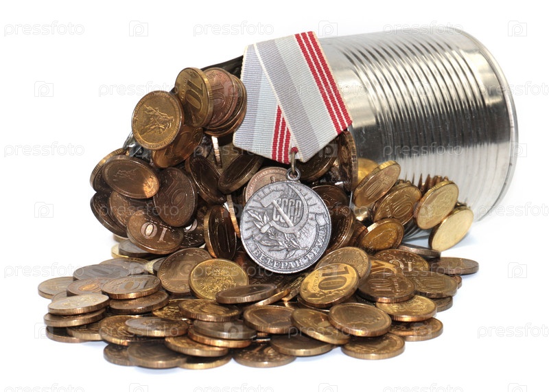 Монеты российские рубли в жестяной банке и медаль ветерана труда как символ успешного работника