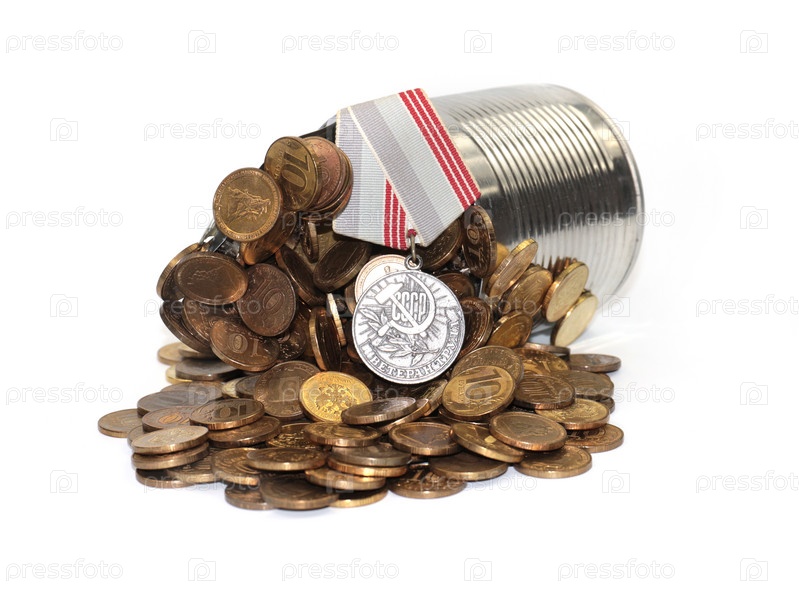 Монеты российские рубли в жестяной банке и медаль ветерана труда как символ успешного работника
