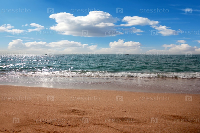 Красивый песчаный пляж средиземного моря и солнечное небо