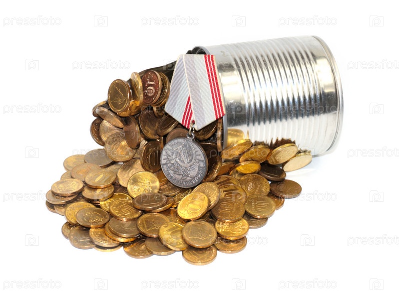 Монеты российские рубли в жестяной банке и медаль ветерана труда как символ успешного работника